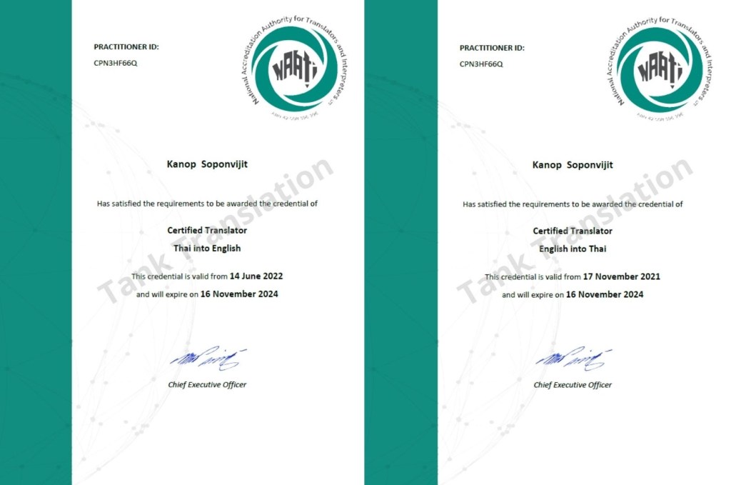 All translations are certified by a translator with NAATI certification and ready for submission to Australian government agencies without requiring additional certification by the Thai Ministry of Foreign Affairs.
